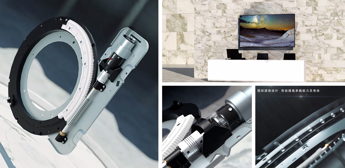 產品說明:電視機智慧屏翻轉驅動系統通過行星齒輪箱和齒輪圓弧圓周運動,提升電視機屏幕的智能翻轉,提高了產品運動的穩定性,降低使用過程中的噪音。